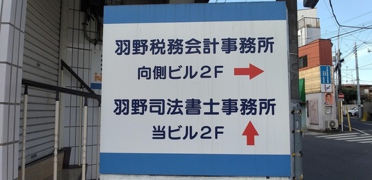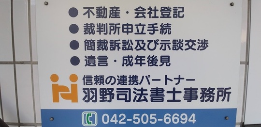 ※南口のロータリーから富士見通りに入り、通りの左側(マクドナルドさん・西友さん側)の歩道を中央郵政研修センター方面に直進し、国立市公民館を通り越して、しばらく行くと信号付交差点があります。そのすぐ先に「羽野司法書士事務所」との案内板がでている建物「センテ国立」の2階です。